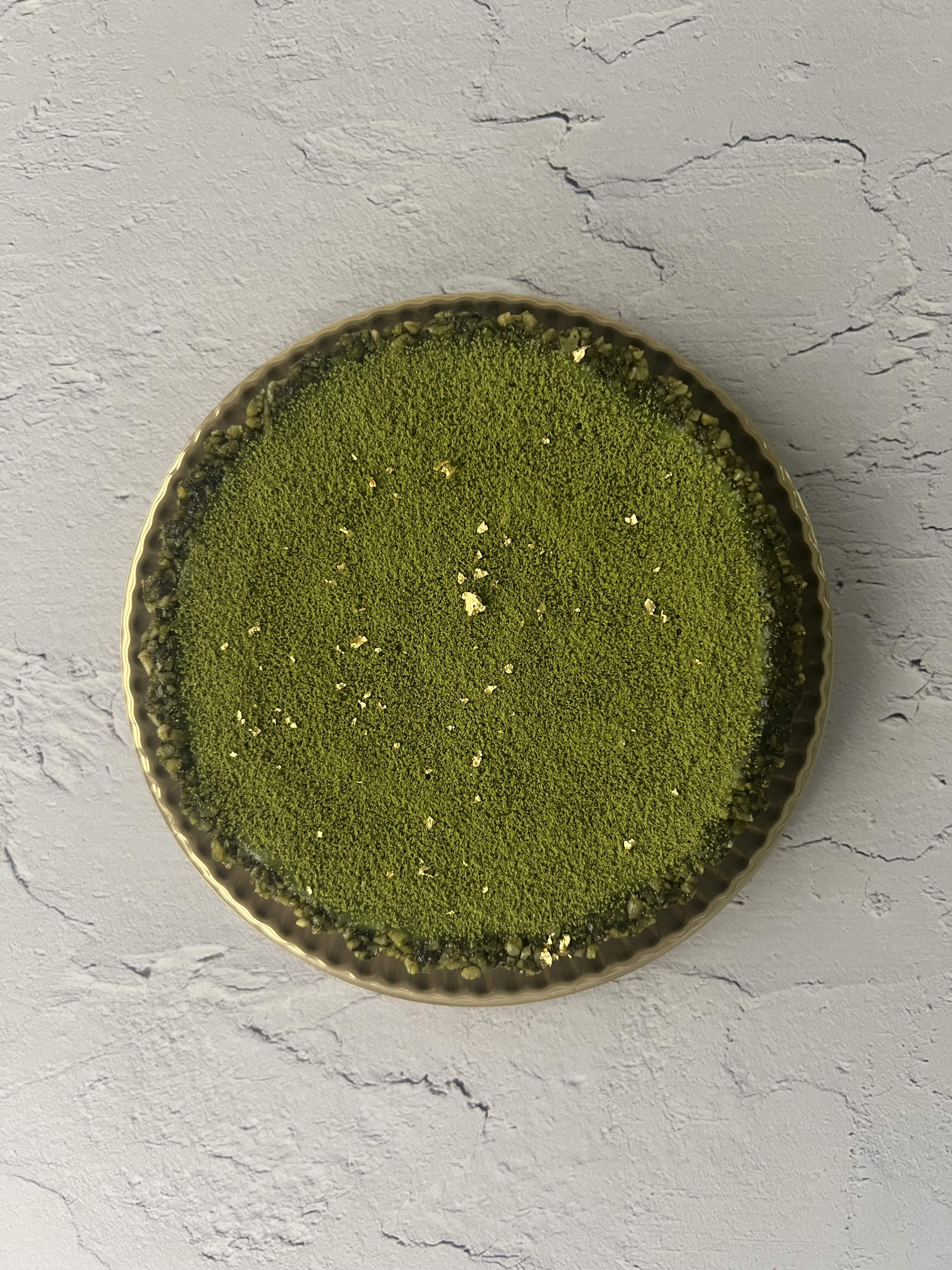 4種の野菜に2種のスーパーフードと、生ナッツや果物の生きた酵素、緑の色素をもつ食材が溢れ出す、抹茶のタルトケーキです。