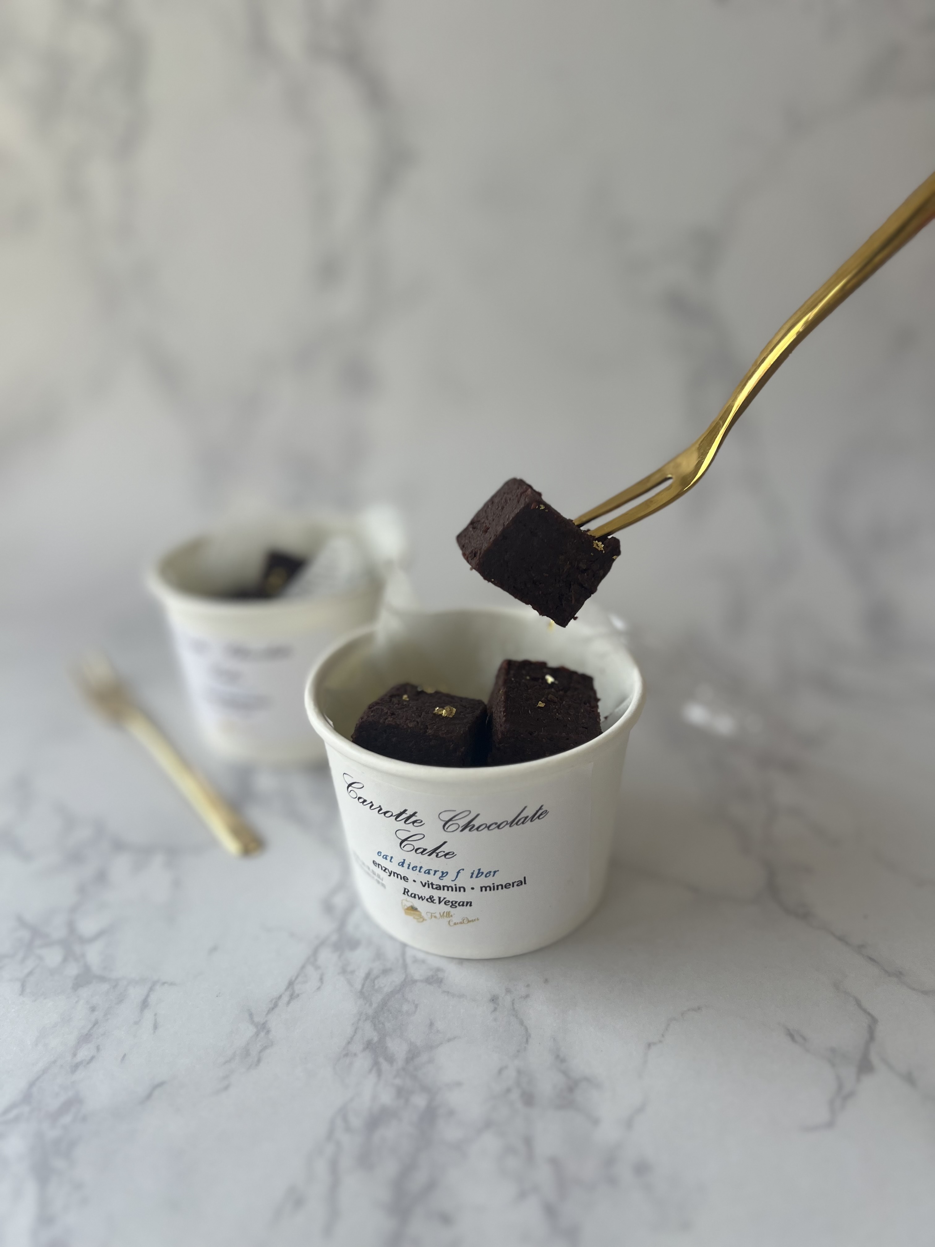 通常よりRawカカオ濃度アップ。香りとコクが深まり、にんじんの甘みと上品に重なる大人味。シュガーやシロップと甘味料不使用。果物の甘さのみグルテンフリーのにんじんをベースにしたしっとりRawカカオショコラケーキ。