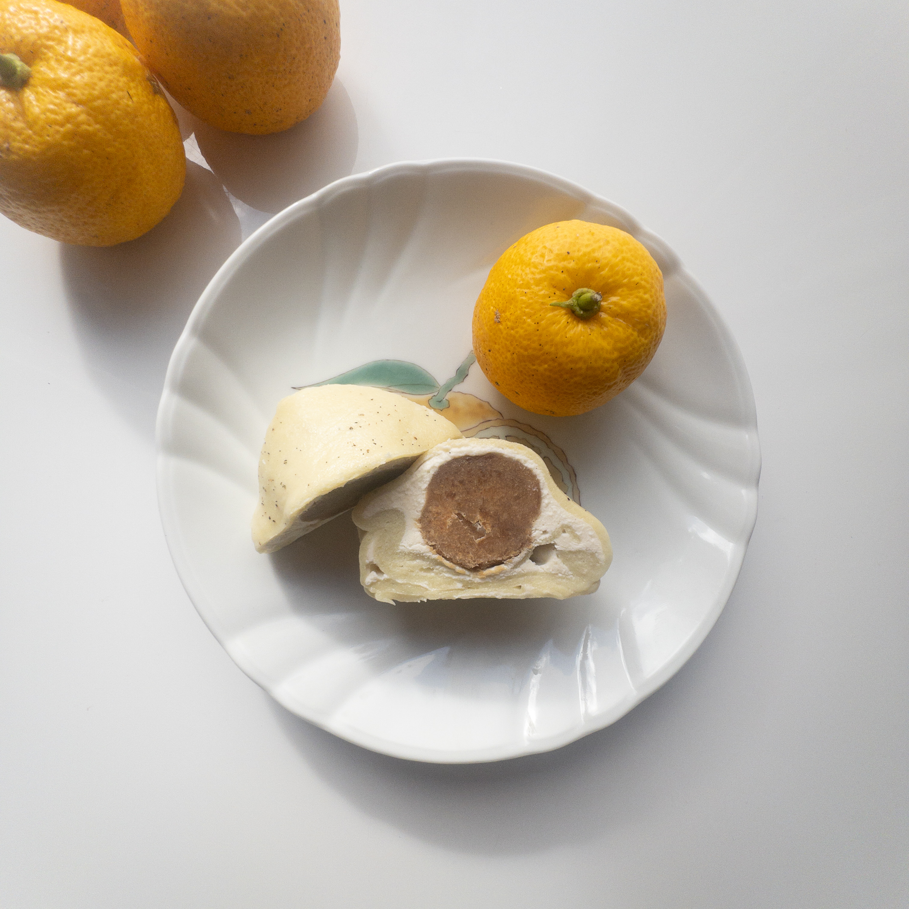 バター・乳製品・白砂糖を使用しない、動物性不使用のヴィーガンオリジナルキャラメルにゆずを一粒に包み込み、加賀丸いも生地に冬の恵みを閉じ込めました。